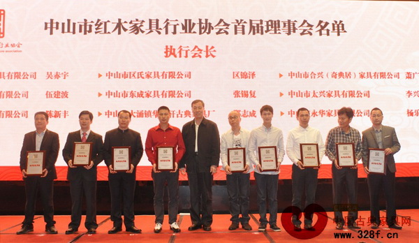 區(qū)氏臻品總經(jīng)理區(qū)錦澤(右四)被授予“中山市紅木家具行業(yè)協(xié)會執(zhí)行會長”榮譽稱號