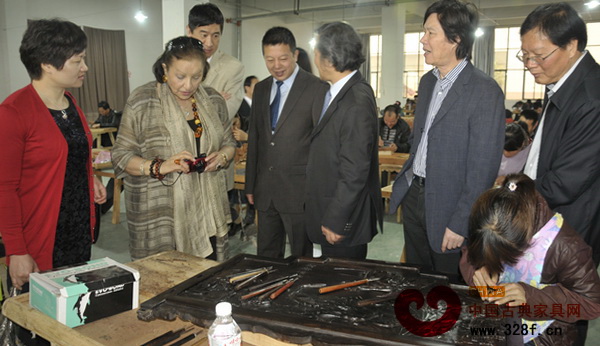 據(jù)悉,去年10月,在印度召開(kāi)的第17屆世界手工藝?yán)硎聲?huì)全體大會(huì)上,東陽(yáng)市作為首個(gè)以地區(qū)組團(tuán)參加的單位向世界手工藝?yán)硎聲?huì)正式遞交了《關(guān)于申請(qǐng)授予東陽(yáng)市“世界木雕之都”榮譽(yù)的請(qǐng)示》,同時(shí)表達(dá)了承辦2014年世界手工藝?yán)硎聲?huì)成立五十周年慶典的強(qiáng)烈愿望,鑒于此,嘎達(dá)博士特于今年來(lái)東陽(yáng)市做實(shí)地考察。在參觀了東陽(yáng)中國(guó)木雕城、陸光正工作室、東風(fēng)竹編廠等地之后,明堂紅木作為大型的紅木家具生產(chǎn)基地迎來(lái)了嘎達(dá)一行的來(lái)訪。
