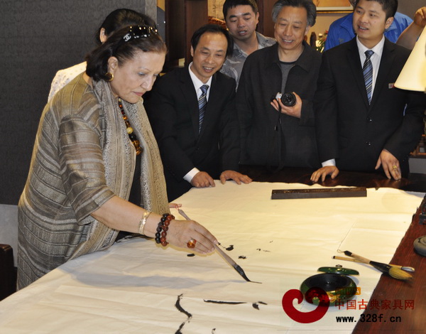 在參觀明堂紅木思想館期間,嘎達(dá)歡喜地欣賞著各式各樣的紅木家具,翻譯告訴大家,嘎達(dá)說(shuō)她很喜歡這些紅木家具,明堂紅木思想館的整體布置也非常漂亮。嘎達(dá)不停地用手中的相機(jī)拍照,她說(shuō)要把在中國(guó)所欣賞到的美好的東西帶回去,并告訴更多的人。興致之余,她拿起中國(guó)的毛筆用科威特語(yǔ)為明堂紅木題字,她告訴大家所寫(xiě)的大體意思是感謝東陽(yáng),并給大家講解每個(gè)字符代表的意思。臨走之前她表示以后有機(jī)會(huì)一定會(huì)再來(lái)東陽(yáng)。(來(lái)源:中國(guó)古典家具網(wǎng) 本網(wǎng)記者∕周曉蘭 劉小娜∕編輯)