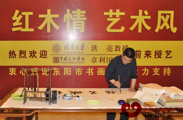 在參觀完振宇紅木展館后,洪亮、章利國教授開始在已準(zhǔn)備好的案臺上寫字作畫,章利國教授邊作畫邊給大家講解作畫的要領(lǐng),還給大家講解如何選擇畫紙和畫紙對畫畫的影響,談笑間一幅花草國畫躍然紙上,色彩艷麗而層次分明,贏得滿堂喝彩。洪亮教授擅長書法,他興致勃勃一連為振宇紅木題寫了“至誠篤信”、“至誠如神”、“千祥云集”、“一言九鼎”等詞。談到東陽木雕和企業(yè)發(fā)展時,洪亮教授說到,東陽木雕的發(fā)展必須走向現(xiàn)代,與時代相結(jié)合,創(chuàng)新發(fā)展。他還強(qiáng)調(diào),企業(yè)發(fā)展到一定階段必須重視文化建設(shè),以文化推動企業(yè)深層次發(fā)展。最后他題寫了“紅木緣 藝術(shù)情”幾個大字贈予東陽市紅木家具行業(yè)協(xié)會曹益明秘書長。(來源:中國古典家具網(wǎng) 周曉蘭∕文 王甜∕編輯)