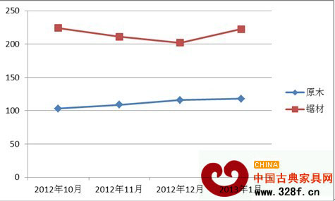 圖II: 中國進(jìn)口紅木原木與鋸材價格指數(shù)變化圖