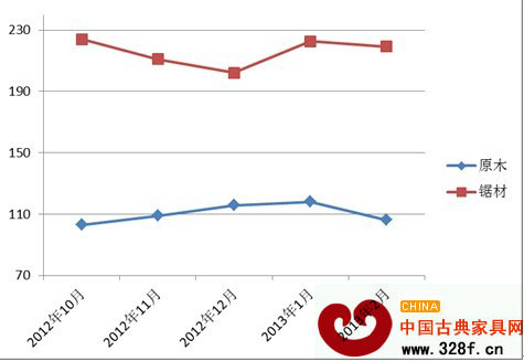 圖2:中國(guó)進(jìn)口紅木原木與鋸材價(jià)格指數(shù)變化圖