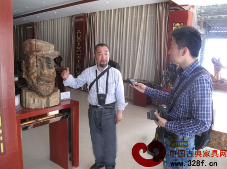 唐國富在向記者介紹他的根雕作品