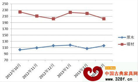 圖II: 中國(guó)進(jìn)口紅木原木與鋸材價(jià)格指數(shù)變化圖