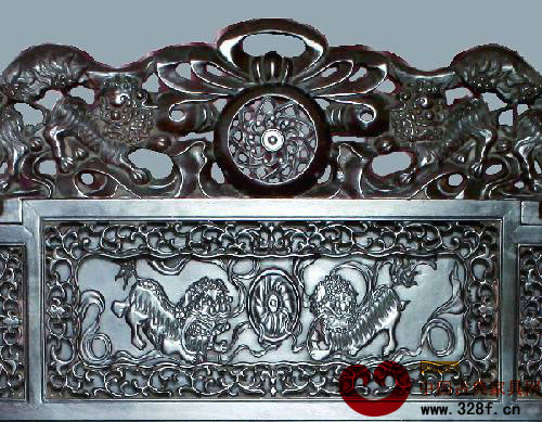 床三圍,背屏圍子攢框三格,中間高兩旁低,鑲?cè)龎K兩層絳環(huán)板制成,20多尊瑞獸獅子有序分布在床體各個部位,姿態(tài)各異,威風(fēng)凜凜,神氣十足……乍看到這張羅漢床時,不由得不讓人為之工藝贊嘆。