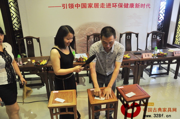 波記家具董事長(zhǎng)伍建波親自為現(xiàn)場(chǎng)的嘉賓及媒體講解光身、打蠟、上漆家具的區(qū)別