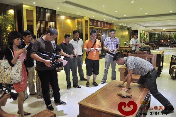 在活動(dòng)最后一個(gè)環(huán)節(jié)——精品紅木光身家具品鑒活動(dòng)上,波記家具董事長(zhǎng)伍建波親自在現(xiàn)場(chǎng)用磨砂紙打磨家具表面,力證波記家具為無漆無蠟的光身家具