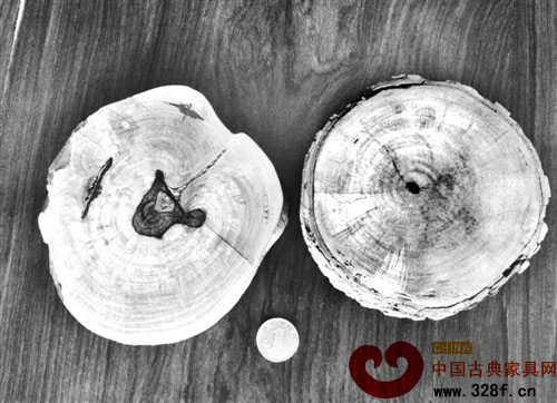 拿一元硬幣對比胸徑20厘米左右的黃花梨,有的心材還沒筷子粗(右),有的心材內(nèi)有雜質(zhì)(左)