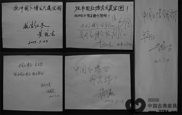 [摘要]2013年7月12日-15日,首屆中國紅博會北京項目說明會現(xiàn)場,中國紅木家具行業(yè)大師、巨頭紛紛為首屆中國紅博會合影留言、簽字祝福,這標(biāo)志著首屆中國紅博會項目說明會北京站取得圓滿成功。