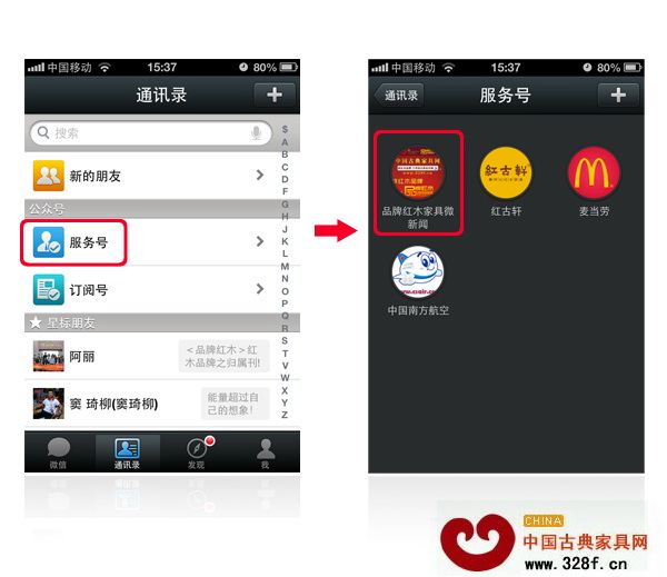 [摘要]【品牌紅木家具微新聞】微信公眾賬號已于2013年8月5日下午14:48分由訂閱號升級為服務(wù)號。目前,已經(jīng)升級為微信5.0版本的用戶可以在【通訊錄】-【服務(wù)號】中找到我們。