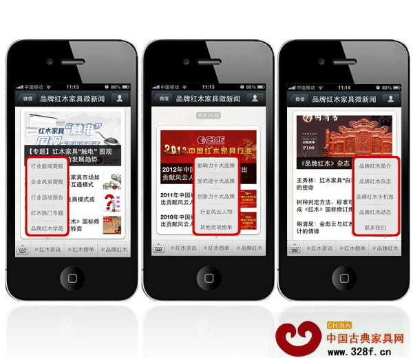 目前,已經(jīng)升級為微信5.0版本的用戶可以在【通訊錄】-【服務(wù)號】中找到我們,每天點擊進(jìn)入【品牌紅木家具微新聞】即可查閱到大量最新紅木資訊,我們將竭誠為您提供更優(yōu)質(zhì)的個性化服務(wù)。在【品牌紅木家具微新聞】調(diào)整升級期間,給您帶來的不便敬請諒解。2013年8月13日,【品牌紅木家具微新聞】全新推出改版升級后的內(nèi)容,通過一系列的改進(jìn),信息內(nèi)容時效豐富,行業(yè)特色清晰明確。敬請關(guān)注!