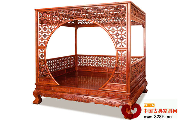 架子床是明代非常流行的一種床,通常它的四角安立柱、床頂、四足,除四角外在正面兩側(cè)尚有二柱,有的為六柱,柱上端承床頂,因?yàn)橄耥敿埽苑Q架子床。架子床的種類較多,有月洞式門架子床、帶門圍子架子床、帶腳踏式架子床等。架子床一般為透雕裝飾,如帶門圍子架子床。正面有兩塊方形門圍子,左、右、后三面也有長(zhǎng)圍子,圍欄上楣子板,四周床牙都雕塑有精美的圖案。架子床的外形酷似一個(gè)縮小的房間,床的柱桿就像房子的立柱;床頂下周圍有掛檐,很像房子中的“雀替”,匠工在其上雕飾花紋,使整個(gè)床器更顯華麗,在床正面裝垂花門的更顯恢弘壯觀;床的下端有矮圍子,其做法圖案紋樣像房子的柱及欄桿,給人的感覺上下相應(yīng),和諧統(tǒng)一,雕工精湛。
