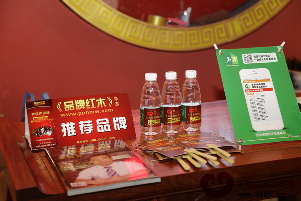 印著中國古典家具網(wǎng)、《品牌紅木》雜志標識的扇子、瓶裝水等物品在紅木家具展廳形成了一道風景線