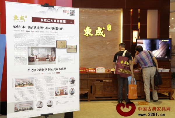 東成紅木在展廳前擺放設計精美的KT板展示企業(yè)特色