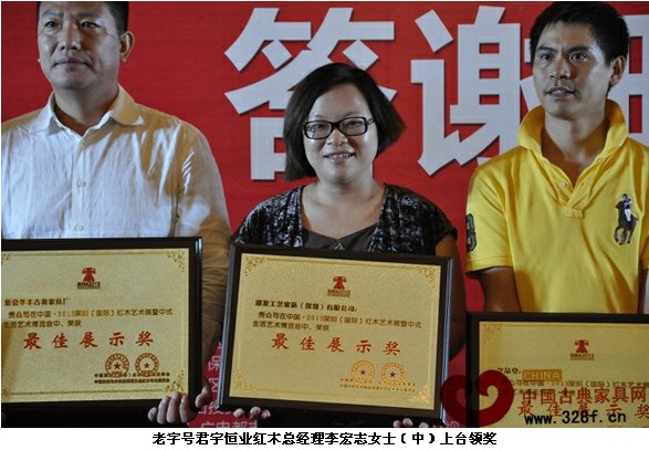 為進一步推動中國紅木文化的弘揚和傳播,本次展會除了針對參展企業(yè)展館、產(chǎn)品進行評比之外,還在現(xiàn)場開展木雕工藝比賽,所有評比結(jié)果均在當晚的頒獎典禮上揭曉。老字號君宇恒業(yè)紅木家具在激烈的競爭中仍然奪得了“中國紅木行業(yè)知名企業(yè)”和“最佳展示企業(yè)”兩項大獎。