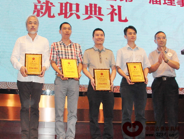 盈聯(lián)匯股東詹惠權(quán)(右一)當(dāng)選為中山市紅木古典家具學(xué)會(huì)副理事長(zhǎng)