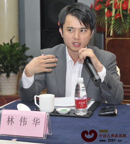 中國(guó)古典家具網(wǎng)、《品牌紅木》雜志CEO、品牌紅木家具經(jīng)銷商聯(lián)盟發(fā)起人林偉華在會(huì)議上發(fā)言