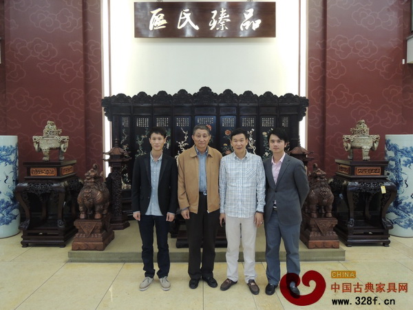 原故宮博物院文??萍疾恐魅?、中國(guó)文物學(xué)會(huì)專家委員會(huì)專家曹靜樓(左二)與區(qū)氏臻品董事長(zhǎng)區(qū)勝春(右二)、總經(jīng)理區(qū)錦澤(左一)以及中國(guó)古典家具網(wǎng)、《品牌紅木》雜志CEO林偉華(右一)在區(qū)氏臻品展廳內(nèi)合影