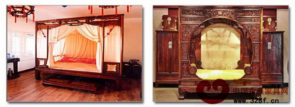 中式家具是自然與濃重的人文色彩巧妙結合的產物,古典家具和現代仿古家具是集家具和藝術品這兩個理念共存的。架子床在明代家具中是體型較大的一種家具,做工精美清雅別致,如以黃花梨木制作,彌足珍貴。清代架子床不僅用料厚重,體型高大,且圍欄、床柱、牙板、四足及上楣板等全部鏤雕花紋,還有在正面裝垂華門的,玲瓏剔透。民國時期架子床的門兩側多鑲有條塞板。