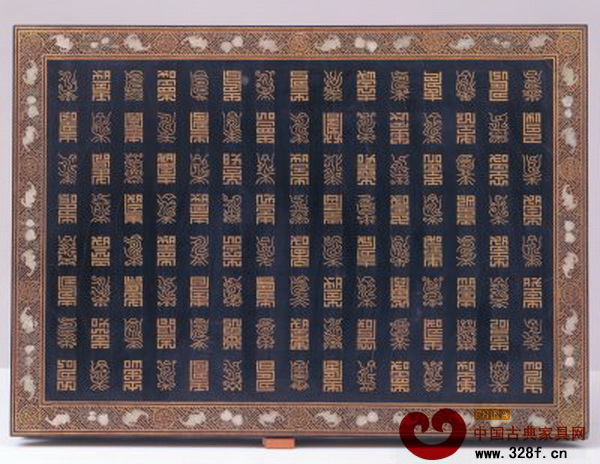 [摘要]黑漆嵌玉描金百壽字炕桌,清乾隆,縱81厘米,高29.5厘米,橫112厘米。
