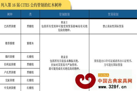 2013年3月,第16屆《瀕危野生動植物種國際貿(mào)易公約》(以下簡稱:CITES公約)締約國大會在泰國曼谷召開。會議發(fā)布了最新246種木材管制樹種,并就最新木材管制樹種進(jìn)行了詳細(xì)介紹和分析,內(nèi)容包括CITES公約介紹、CITES公約對木材行業(yè)的管制情況以及所有管制木材樹種、紅木管制樹種和管制級別等情況。紅木5屬8類33種木材中的五大樹種——交趾黃檀、中美洲黃檀、微凹黃檀、伯利茲黃檀和盧氏黑黃檀被列入附錄二,即被定為了為目前尚無滅絕危機(jī),但仍面臨貿(mào)易壓力、族群量繼續(xù)降低的一類,CITES公約對多種紅木材質(zhì)的管制至此開始生效。