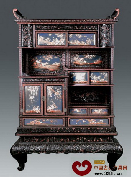 [摘要]藏品描述:整器以木胎髹漆嵌百寶制成,以朱漆為底,堆塑黑漆浮雕牡丹、龍、鳳紋等圖案,柜頂兩端裝鴟吻狀翹頭,柜邊刻回紋裝飾。