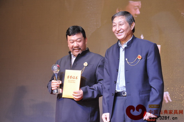 原故宮博物院文保科技部主任、中國文物學會專家委員會專家曹靜樓(右)為明清居紅木董事長金彪云頒發(fā)“中國紅木家具行業(yè)十大風云人物”獎杯