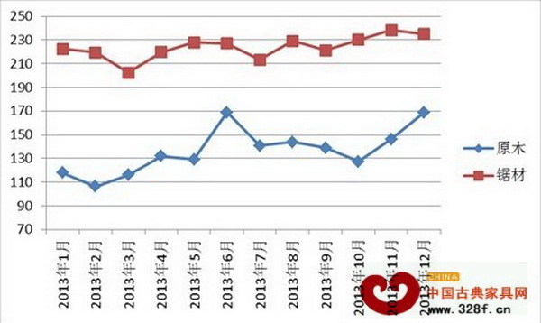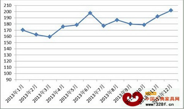[摘要]2013年12月,中國紅木進(jìn)口綜合價格指數(shù)(HIPI)為201.9。同比上漲42.9%,環(huán)比上漲9.7%。