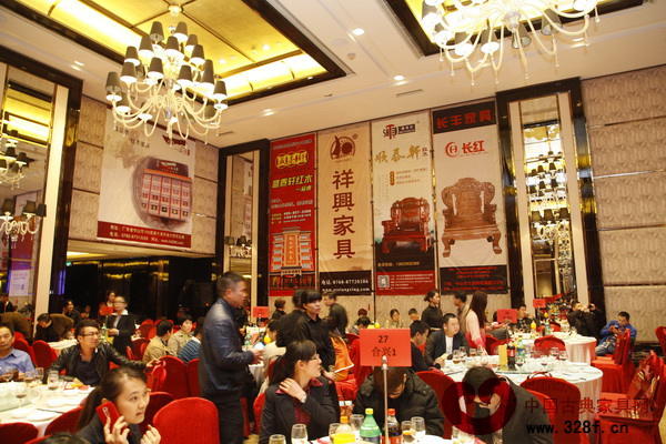 “紅博城之夜”2014中國(中山)紅木家具文化博覽會歡迎晚宴現(xiàn)場祥興家具的KT版贊助廣告