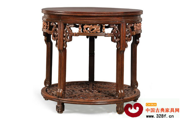 此圓桌以紅木為材,用料奢侈,色澤雅麗,攢框裝板為之案面,五面牙板均透雕花卉紋,牙板間置葫蘆形矮老,其間鑲嵌黃楊木雕花卉,刀法豪爽利落,頗具氣度。下承透雕如意結(jié)形底板,寓意祥和吉慶,其下以雕如意形足托之,予人以雍容華貴之感。