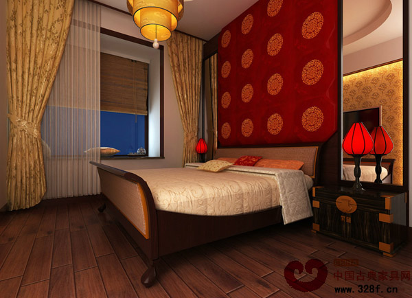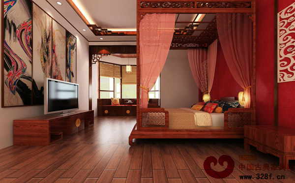 主臥紅色的裝飾可襯托出豪華,祥云花格、一幅具有生命力的墻畫讓整個空間神韻十足。紅木更是讓整個空間獲得溫馨寧靜的感覺。