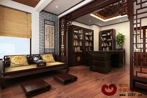 書房里中式家具與書柜、字畫,在配以中式風(fēng)格的屏風(fēng)加以點(diǎn)綴,構(gòu)成了一副完美的藍(lán)圖。