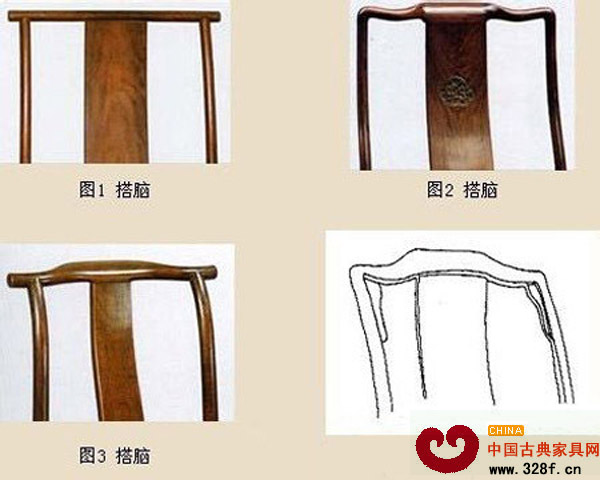 搭腦是椅子上端的橫梁,因坐時(shí)后仰腦袋搭于其上而得名。另外,巾架、盆架、衣架上面的橫梁也引申稱作搭腦。其基本形式有圓形、扁形、方形三種。