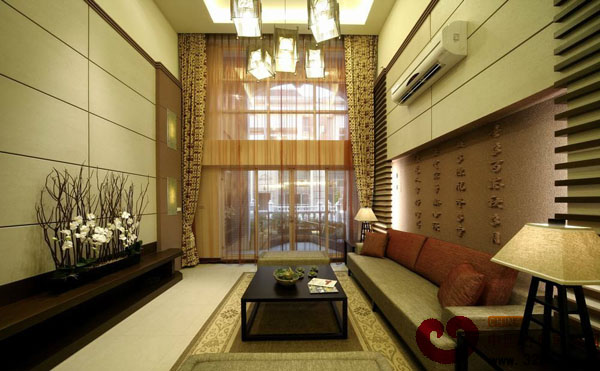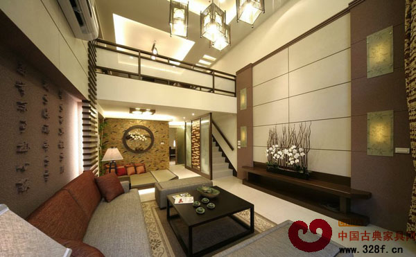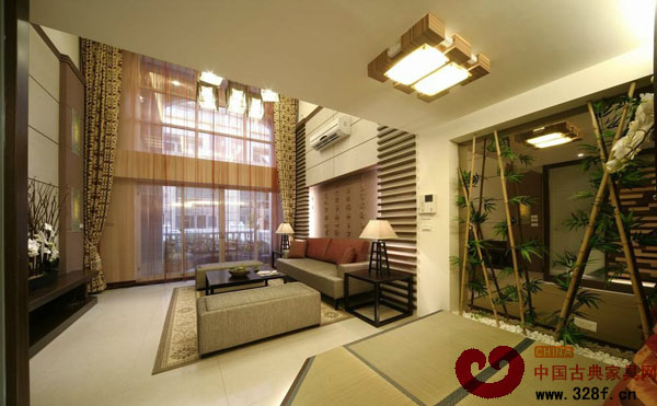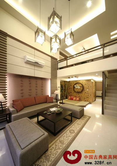 挑高空間-燈籠造型的客廳主燈,點(diǎn)出古色古香的禪風(fēng)主題。