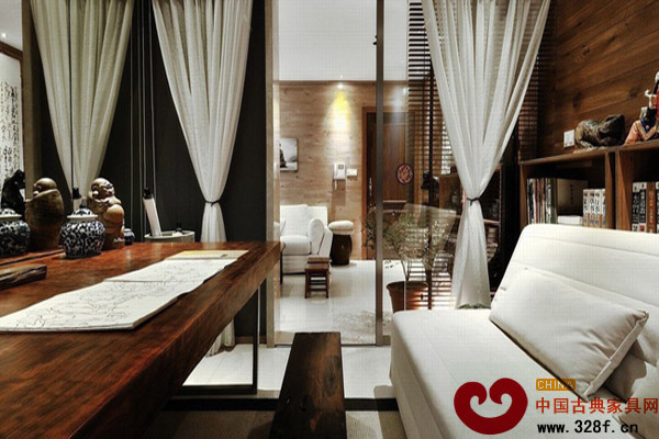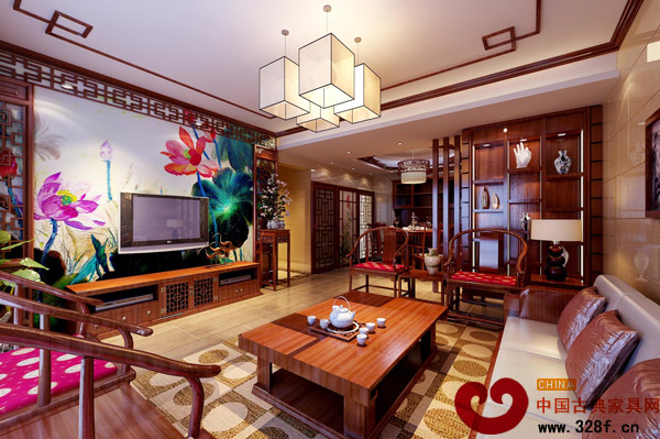 亦真亦幻、似虛似實(shí)的背景,放射出一種柔和的淡黃色光線,通過隧道似的絕妙場景映照到“隧道”兩旁的客廳,讓客廳有一種似明似暗的神秘感,顯得深邃與空曠。置身其間,可以放飛想象的翅膀,捕捉到蘭桂般的馨香。