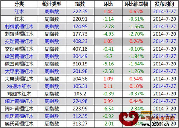中國(guó)紅木價(jià)格指數(shù)各分類(lèi)指數(shù)漲跌表