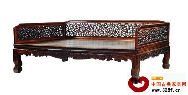 三圍板螭紋羅漢床。尺寸之巨號(hào)稱目前黃花梨中最大的:約長(zhǎng)247厘米深175厘米。