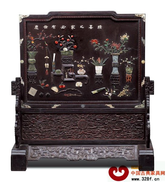 嵌螺鈿,指取材于各種貝殼色澤光華最佳的部位,分層剝離和裁制后鑲嵌于木、漆器之上作為裝飾。如果在一件家具上嵌入用多種名貴材料如玉、石、牙、角、瑪瑙、琥珀等制成的裝飾物,則就是我們俗稱的百寶嵌。(來源:中國古典家具網(wǎng) 邱蔚∕文)