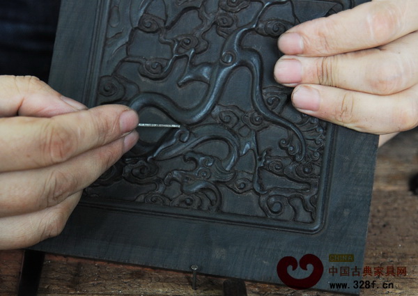 紫光檀材質(zhì)硬、密度大,因此雕刻極為費(fèi)時(shí)費(fèi)力(九龍?zhí)霉﹫D)