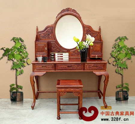 據(jù)資料顯示,梳妝臺在明代就已出現(xiàn),不過那時只是大家小姐閨房中的擺設。古典梳妝臺分高低兩種,高者類似專用的桌子,臺面上豎著鏡架,旁設小櫥數(shù)個,鏡架中裝一塊大玻璃鏡,又名鏡臺,這在清代中期已很常見。低鏡臺形體較小,一般放在桌案上使用。鏡臺下面設小抽屜數(shù)個,面上裝圍子,常見的還有在臺面后部裝一組小屏風的,三至五扇不等,屏前有活動支架,用以掛鏡,又名“鏡支”。也有的不裝屏風和圍子,而是在臺面之上安一箱蓋,打開蓋子,支起鏡架,即可使用。