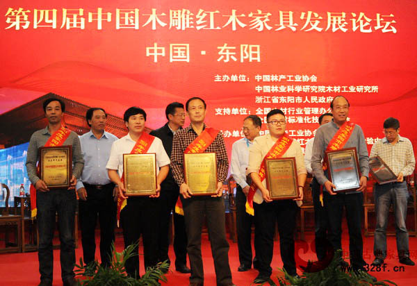 此次論壇的第二階段進(jìn)行了東陽(yáng)市2014年度木雕·紅木家具行業(yè)頒獎(jiǎng),東陽(yáng)市人民政府副市長(zhǎng)畢偉文宣讀獲獎(jiǎng)名單并主持頒獎(jiǎng)儀式,國(guó)家林業(yè)局計(jì)財(cái)司副司長(zhǎng)、全國(guó)木材行業(yè)管理辦公室主任孫健,國(guó)家質(zhì)檢總局科技司處長(zhǎng)王繼偉等領(lǐng)導(dǎo)為獲獎(jiǎng)企業(yè)頒獎(jiǎng)。卓木王榮獲2014年度東陽(yáng)市木雕·紅木家具龍頭骨干企業(yè),其產(chǎn)品《天圓地方沙發(fā)》獲2014年度東陽(yáng)市木雕·紅木家具十大精品,“卓木王”品牌榮獲2014年度東陽(yáng)市木雕·紅木家具“質(zhì)量信得過(guò)品牌”。卓木王三次站上領(lǐng)獎(jiǎng)臺(tái),成績(jī)斐然。