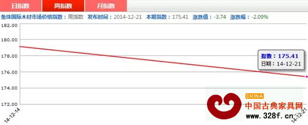 12月15日—23日,紅木分類指數(shù)總體呈下跌趨勢,周指數(shù)收于175.41點,成交額較前周下跌了3.74點,跌幅為2.09%。在代表材方面,奧氏黃檀漲幅最為明顯,漲幅為0.67%;微凹黃檀持續(xù)下跌態(tài)勢,跌幅為6.58%。