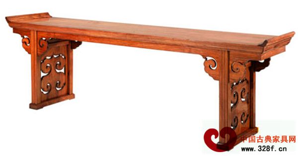 還有一種與案稍有不同的家具,它的兩側(cè)案足不帶托子,前后腿間也無圈口和雕花板心,而是在腿間中部稍上一點(diǎn)的位置加兩根直形橫棖。有的在左右腿間不用長牙板,而是在兩腿之間加長橫棖,除了以上幾點(diǎn)不同外,其他部分則與案無異。如果面上兩端裝有翹頭,無論大小,一律稱為翹頭案;如果兩端沒有翹頭,那就不一定稱其為案了,這類家具,人們通常把較大的叫做“案”,較小的叫做“桌”。