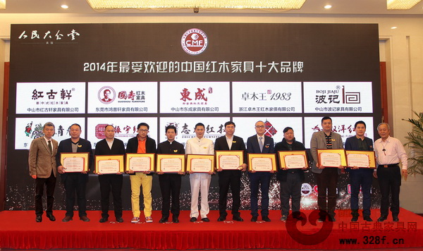 紅古軒榮獲“2014年最受歡迎的中國(guó)紅木家具十大品牌”(左六為紅古軒總經(jīng)理吳赤宇上臺(tái)領(lǐng)獎(jiǎng))