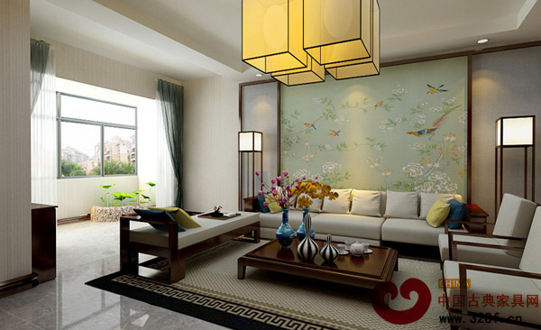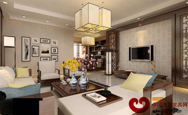 [摘要]客廳采用實(shí)木沙發(fā)搭配麻布布藝,再加上藍(lán)灰色布藝窗簾,使得會(huì)客空間充滿(mǎn)舒適愜意的氛圍。電視墻采用中式木雕花格搭配壁紙,古樸、自然。