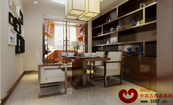 餐廳靠墻做了一整面的博古架,為了不會(huì)顯得壓抑,整個(gè)博古架的架構(gòu)盡量用敞開(kāi)式的手法來(lái)做,顏色上在客廳的深木色做了延續(xù),顯得和諧統(tǒng)一。