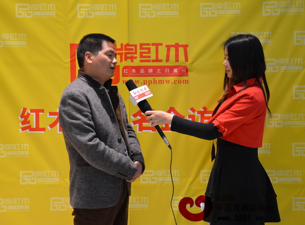 中信紅木董事長李忠信在東莞名家具展上接受《品牌紅木》雜志記者采訪