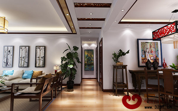 天花以木條相交成方格形,上覆木板,也可做簡單的環(huán)形的燈池吊頂,用實木做框,層次清晰,漆成花梨木色。