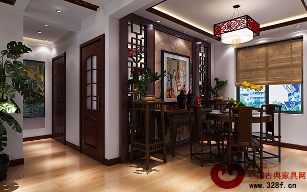 空間上講究層次,多用隔窗、屏風來分割,用實木做出結實的框架,以固定支架,中間用欞子雕花,做成古樸的圖案。