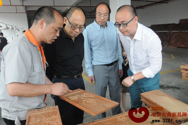 中國家具協(xié)會副理事長陳寶光(左二)參觀卓木王紅木雕刻車間,和雕刻工人交流